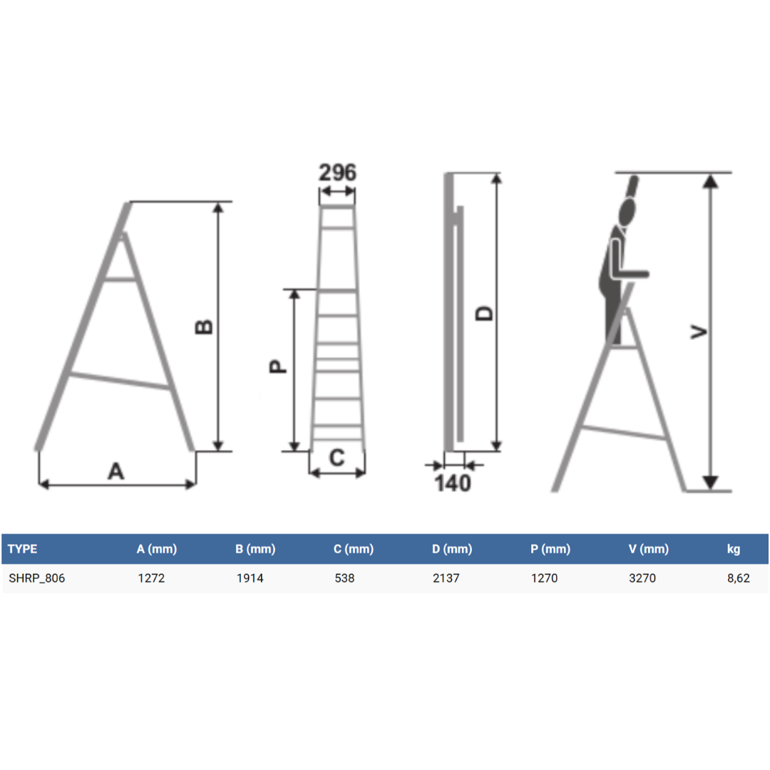 Dla wygodnego i bezpiecznego korzystania drabina wyposażona jest w szeroki podest z antypoślizgowymi karbami. Także stopnie są szerokie i posiadają antypoślizgowe wcięcia dla jeszcze większego bezpieczeństwa. Jest to niesamowicie praktyczne i wygodne w korzystaniu. Antypoślizgowe stopki zapewniają bezpieczeństwo i stabilność podczas pracy. Ograniczniki rozstawu także są wykonane z aluminium co zapewnia drabinie stabilność. By ułatwić korzystanie z drabiny ma ona dłuższą poręcz co jest wygodne przy wchodzeniu i schodzeniu.